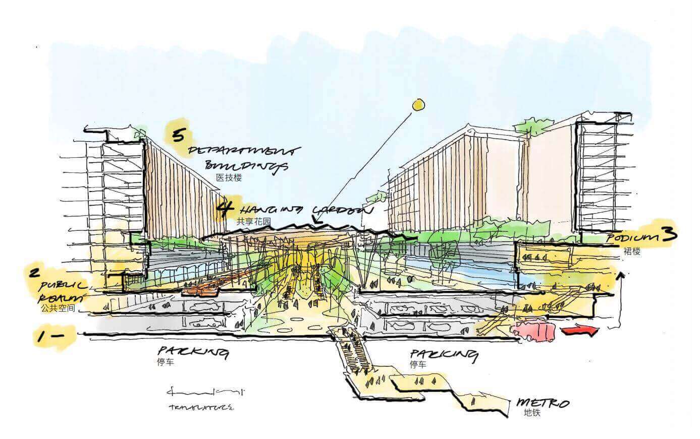 我们构想了深圳市人民医院的全新愿景,是设想将其作为一个整体打造成位于深圳城市中 心、同时是世界级水准的一流医学与研究园区。该设计与周边文脉、城区环境融为一体,构筑城市中心的健康保护区,身处这飞速发展中的城市“心脏”位置而为其注入宝贵的“绿色”能源。