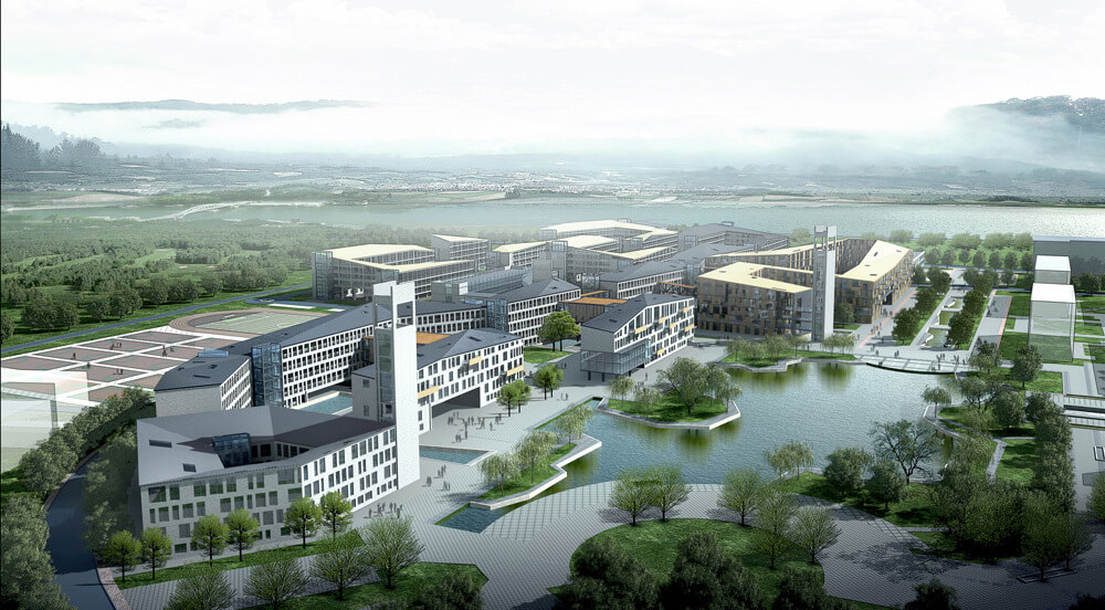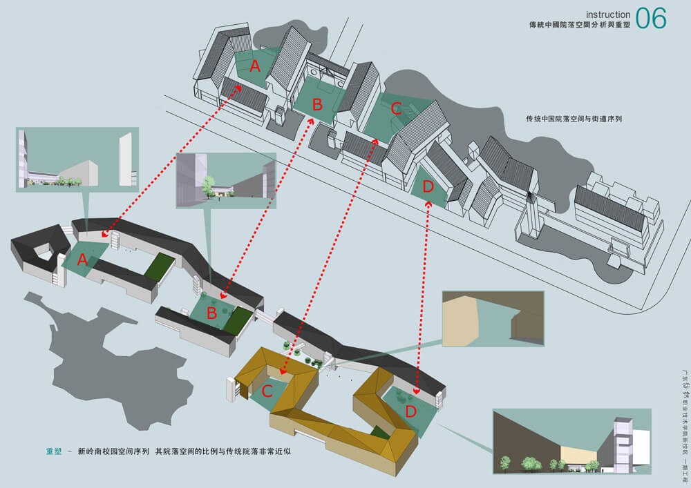 新规划尊重原有校区规划。在原有规划的框架下,基于对基地周边地形的理解,以及对山、水这些自然元素的关系进行探讨。我们将交织在一起的功能区块进行“小位移,小转向”。营造出具有岭南现代风格的校园建筑,以及灵动的校园空间。
