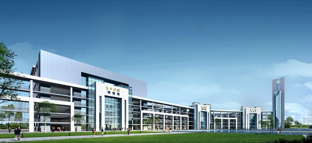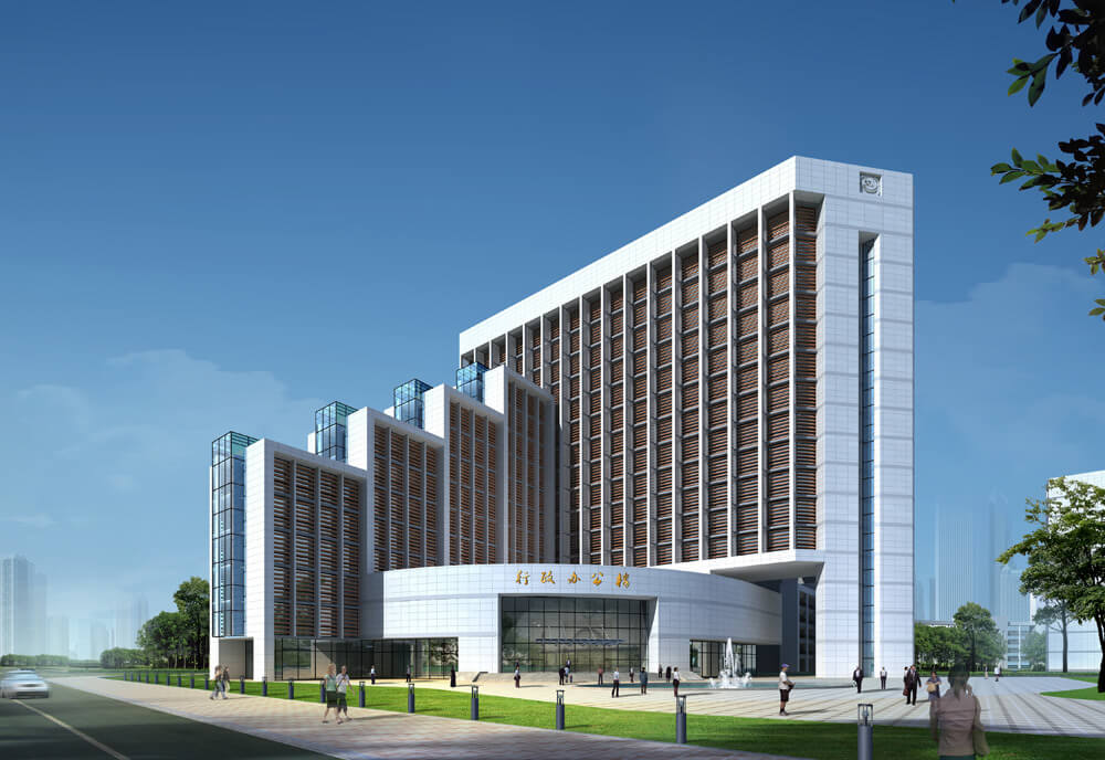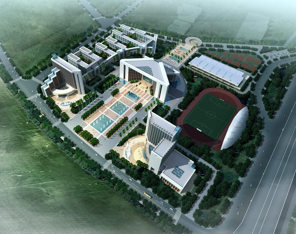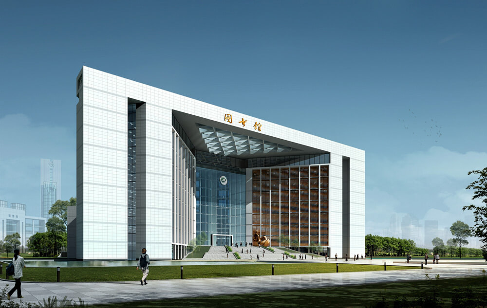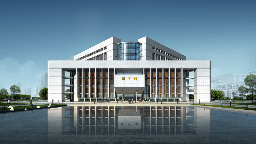 规划将图书馆建筑布景在校园中心,呈众星捧月之势。用现代化造型手法将图书馆塑造成校园标志性建筑。充分彰显图书馆在校园中的核心地位。将学校“四大主体”(教学科研、实验实训、管理指挥和体能训练)巧妙地融合在一起。四大主体功能与中心主体建筑构成强烈的向心关系,和谐共生。
