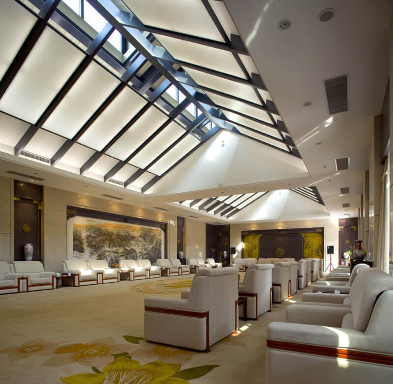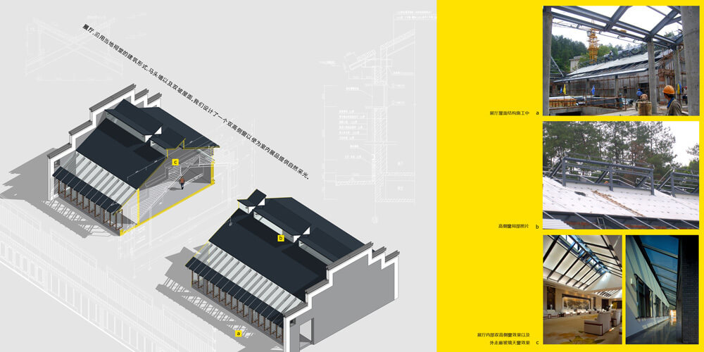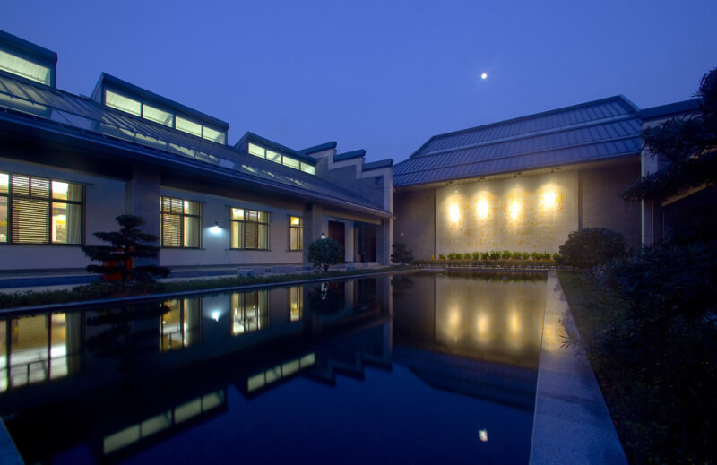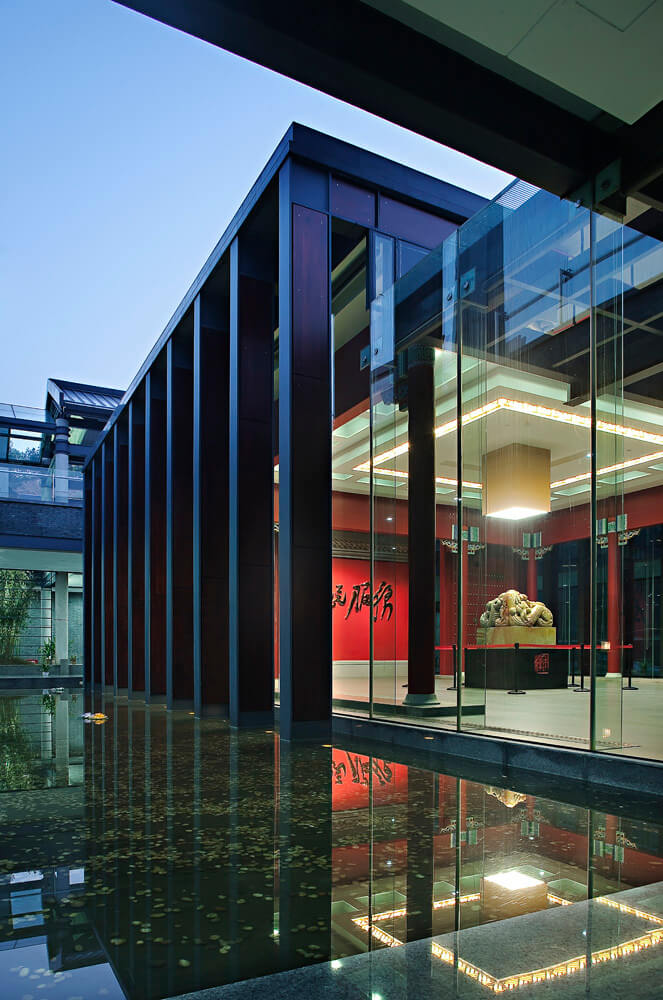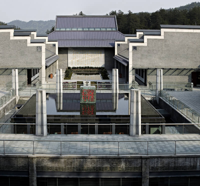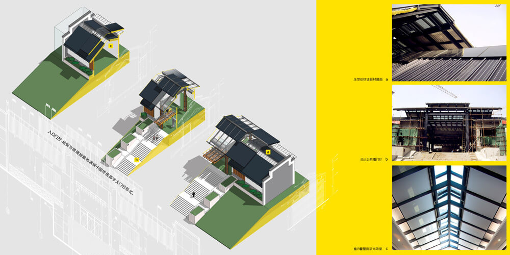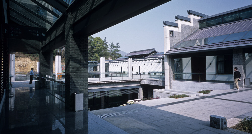 设计利用地形现状的大高差,创造出了一个立体庭院空间。主轴方向的两进庭院处理颇有特色,缅怀厅大胆地放在第一进庭院的中央,是两条轴线的交汇点,顶上是缅怀广场的水池。在第二进庭院,首层在展厅中嵌入了三个小院,至二层又扩大为一个大庭院,空间形态和处理手法都有新的突破。