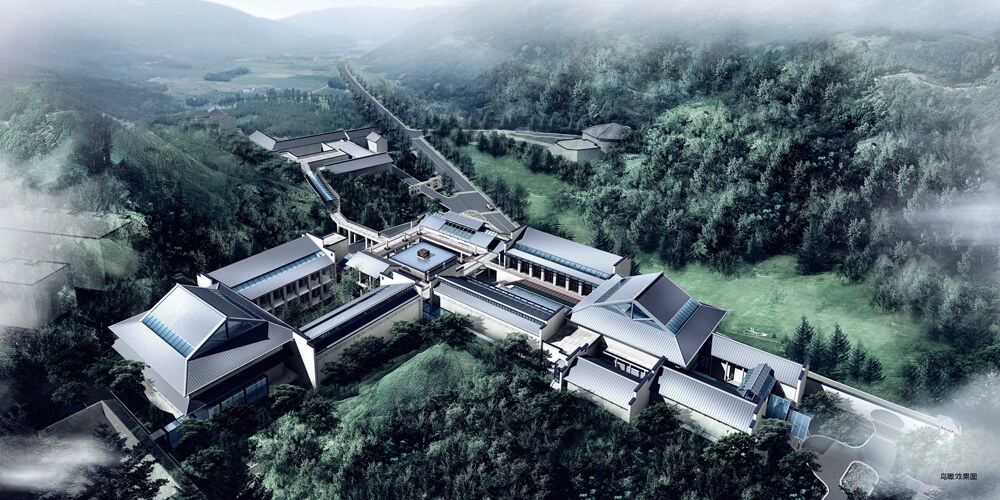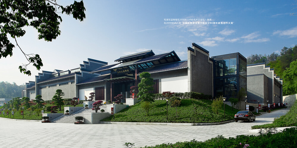 设计充分体现对用地原有地形、地貌的尊重。建筑依山就势,层层叠落,采用分散式院落组合布局,设计了展现毛泽东同志作为中国人民的革命领袖的宏伟气魄和作风俭朴、平易近人的人格魅力,深入观察了韶山地区的自然环境和人文环境,把双坡屋顶、风火墙、吊脚楼……这些具有湖南民居建筑特色的建筑元素抽取出来,用现代建筑材料和手法加以演绎。意在历史与当代之间建立一座桥梁,引发人们对伟大领袖毛泽东的景仰和缅怀。